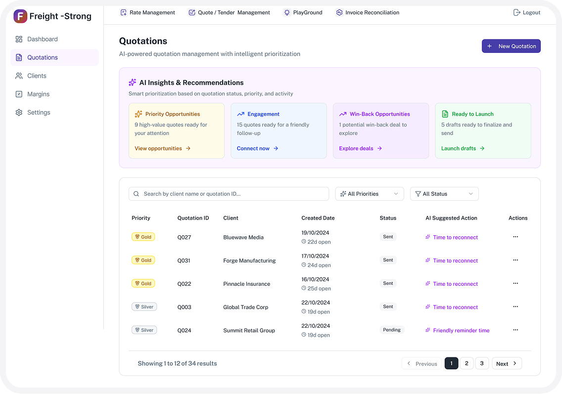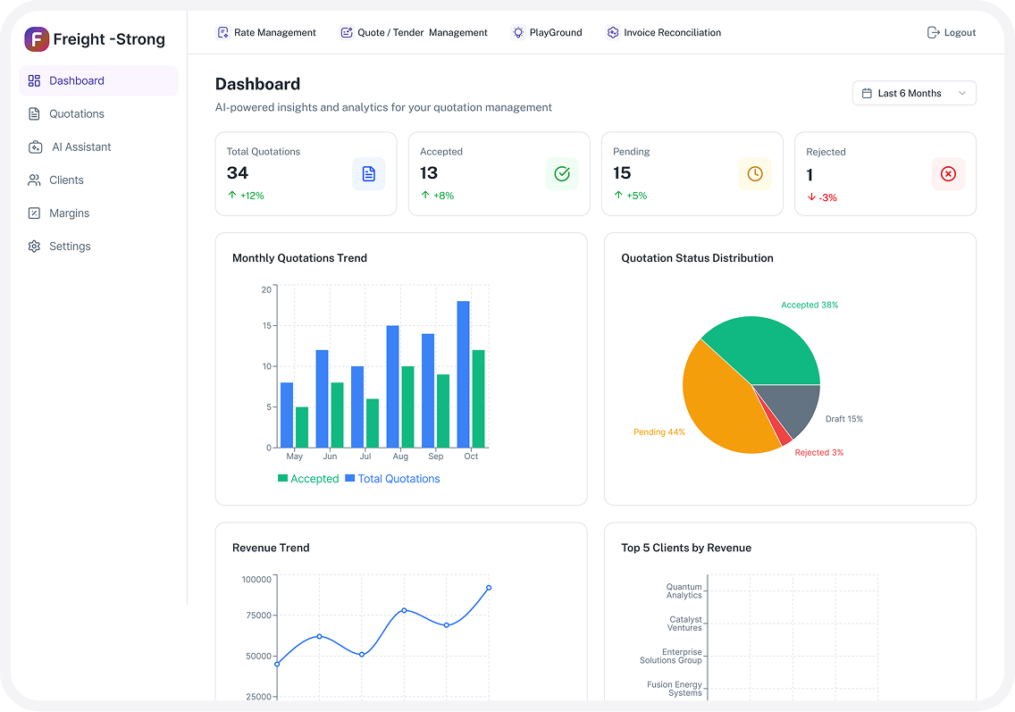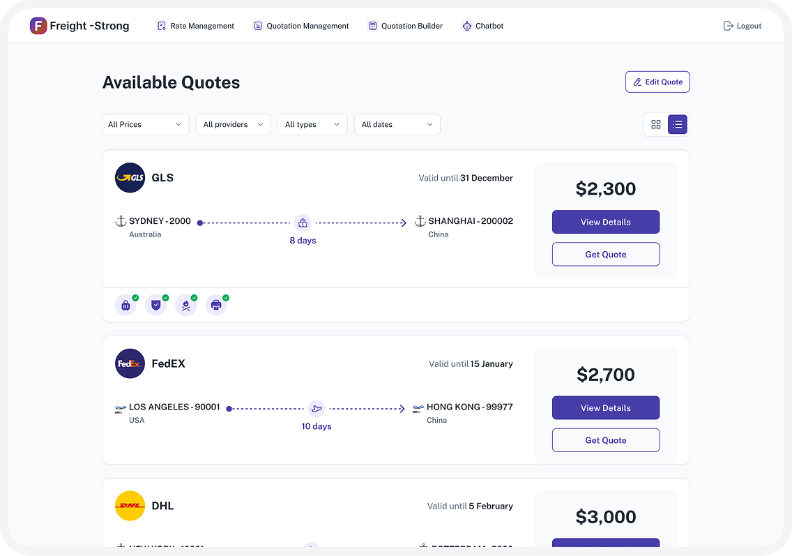 Fretara creates consistent, professional quotes tailored to your brand, using the best available rates and predefined margin rules. Sales teams respond faster while maintaining pricing discipline and profitability.