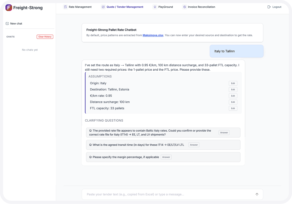 Upload a real carrier rate sheet and watch Freight-Strong normalize, calculate, and generate accurate quotes in minutes.